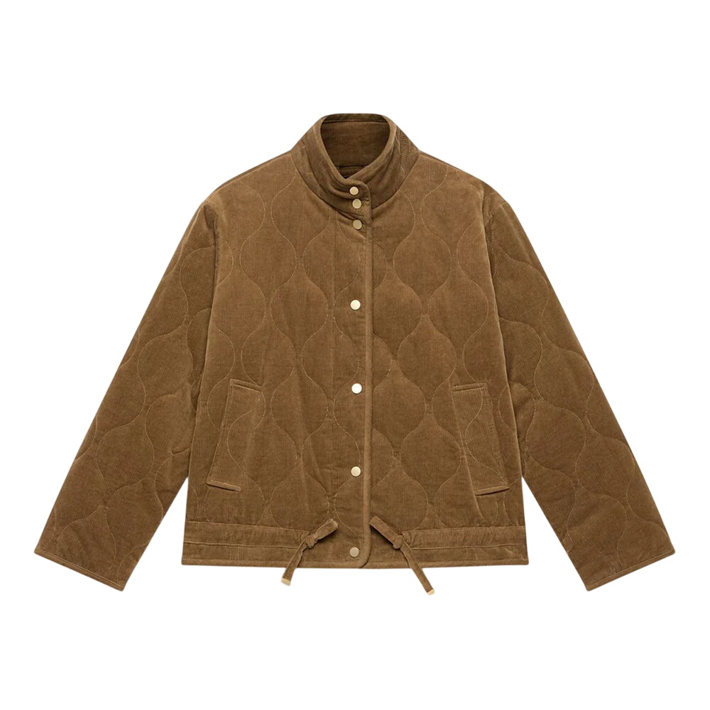 - Brown quilted jacket featuring a high neckline, long sleeves, welt pockets, drawstring waistband with a popper fastening through the front.
