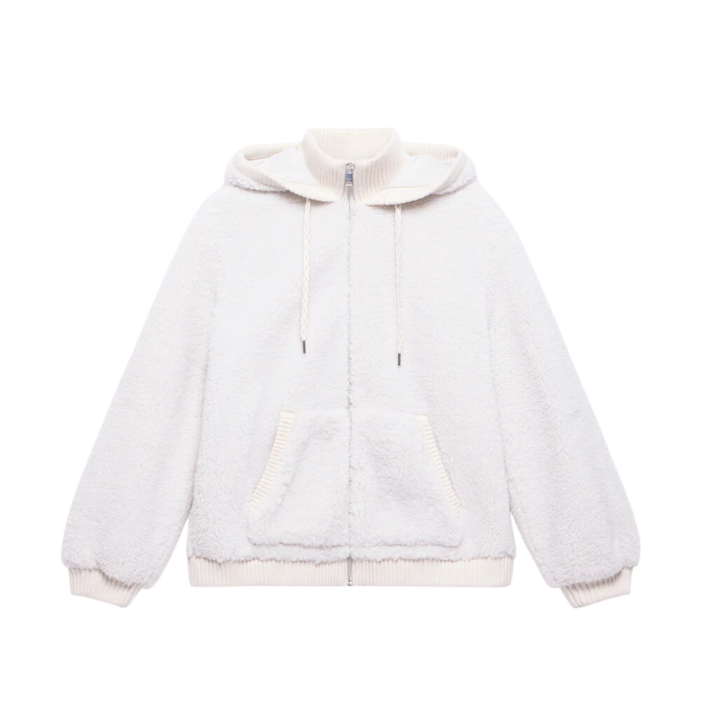 - Cream borg jacket featuring a high neckline, drawstring hood, pouch pocket, ribbed trim, long sleeves and a zip fastening through the front.