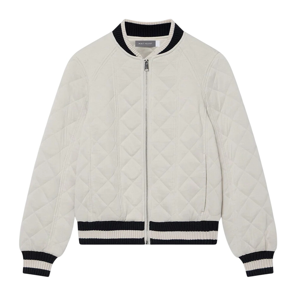 - Cream diamond quilted jacket featuring a contrast knit high neckline, long sleeves, elasticated knit cuffs and a zip fastening through the front.