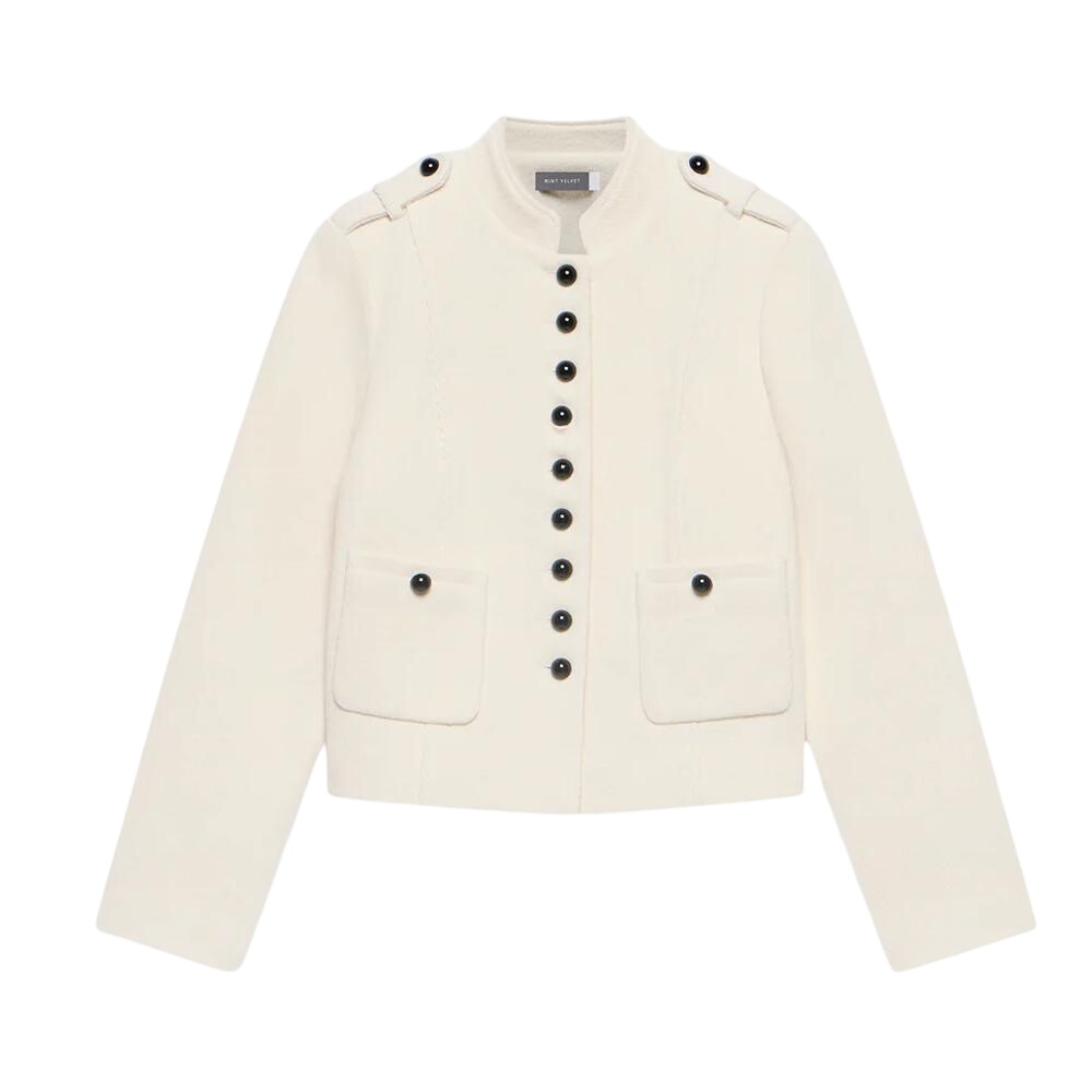 - Cream military jacket featuring a high neckline, epaulettes, long sleeves, buttoned cuffs, square pockets with a button fastening through the front.