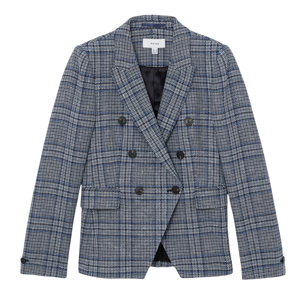 REISS Larissa Double-Breasted Check Blazer Cotton-Linen in Navy Check