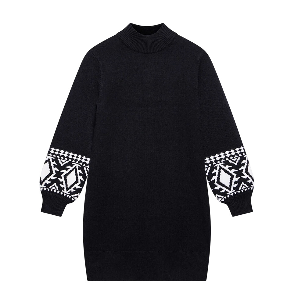 - Black knit dress in a mini silhouette featuring a high neckline, long sleeves with contrasting graphic detailing.