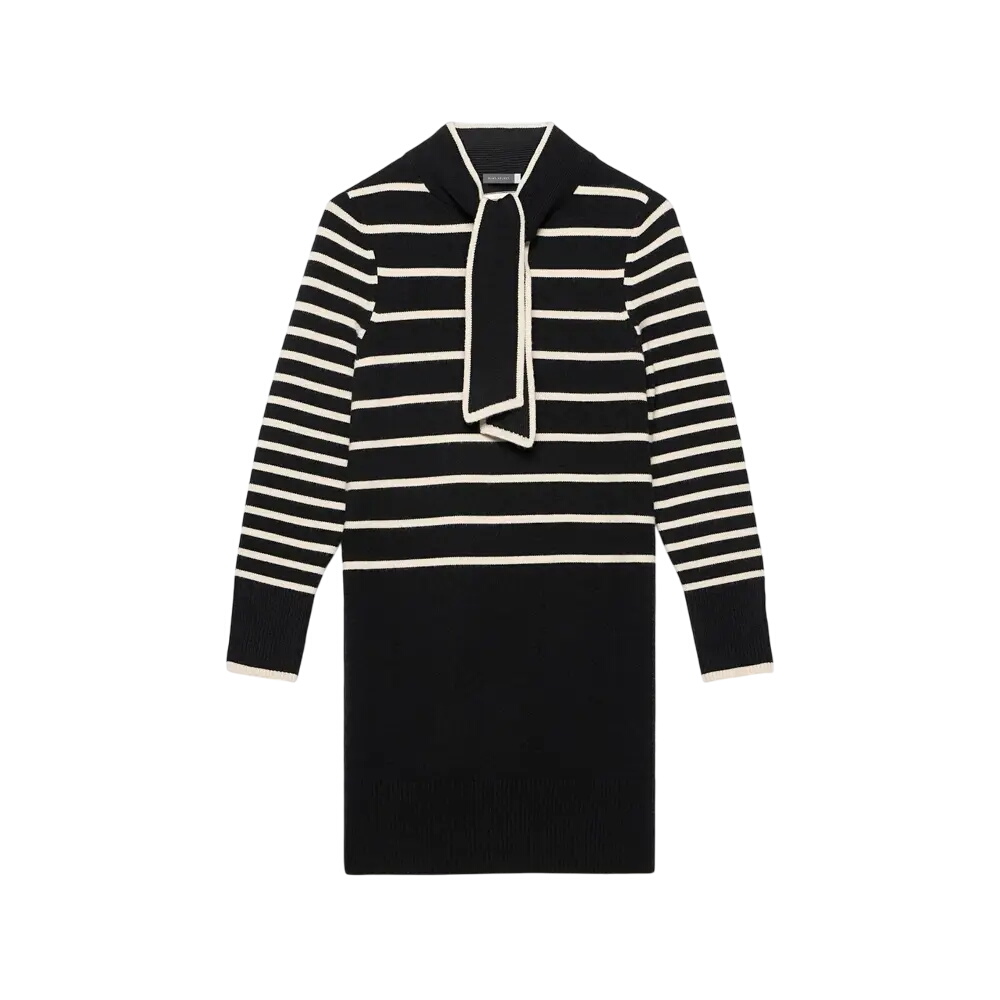- Black striped dress in a mini silhouette featuring a built in scarf neckline, long sleeves with button detailing on the cuffs.