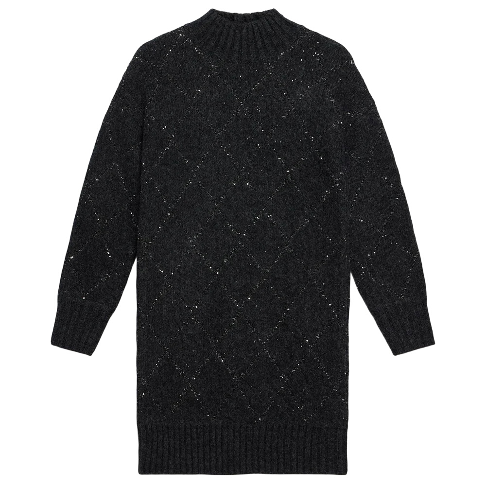 - Dark grey knit jumper in a mini silhouette featuring a high neckline, long sleeves and sequin embellished argyle design.