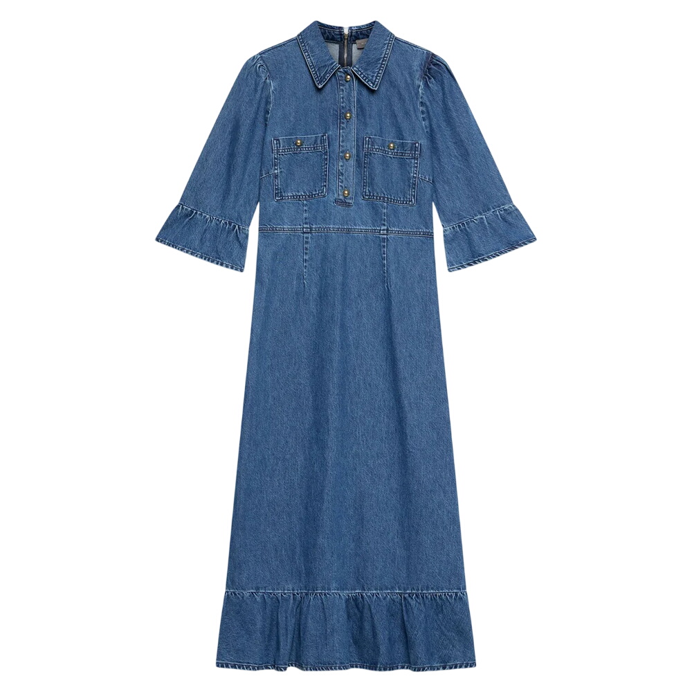- Indigo denim shirt dress in a midi silhouette with a classic collar, 3/4 fluted sleeves, chest pockets, ruffle hemline, featuring button fastenings through the front and a zip fastening through the back.