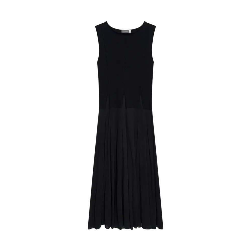 - Navy sleeveless dress in a maxi silhouette featuring a crew neckline and split seam, waistline.