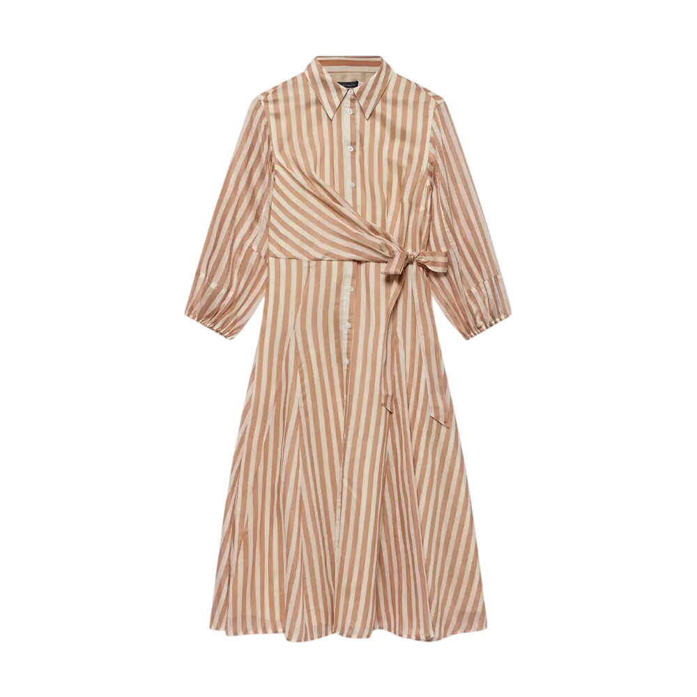 - Orange striped shirt dress in a midi silhouette featuring a classic collar, long blouson sleeves, elasticated cuffs, wrap tie feature at the waistband, godet hemline and a button fastening through the front.