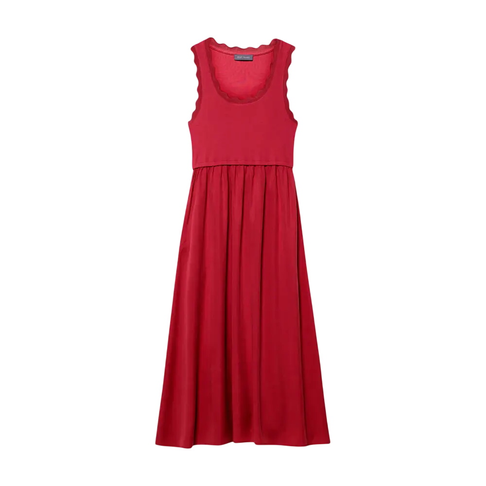 - Red tone sleeveless dress in a midi silhouette featuring a scoop neckline and scallop trim.