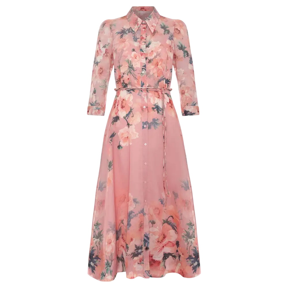 Pretty in pink and vibrant florals, this midi shirt dress features a feminine A line skirt, elegant ¾ sleeves and a tie belt for highlighting your shape. Designed in a soft sheer fabric this timeless floral dress feels like spring, all year round. Style with heels and matching clutch to finish the look.