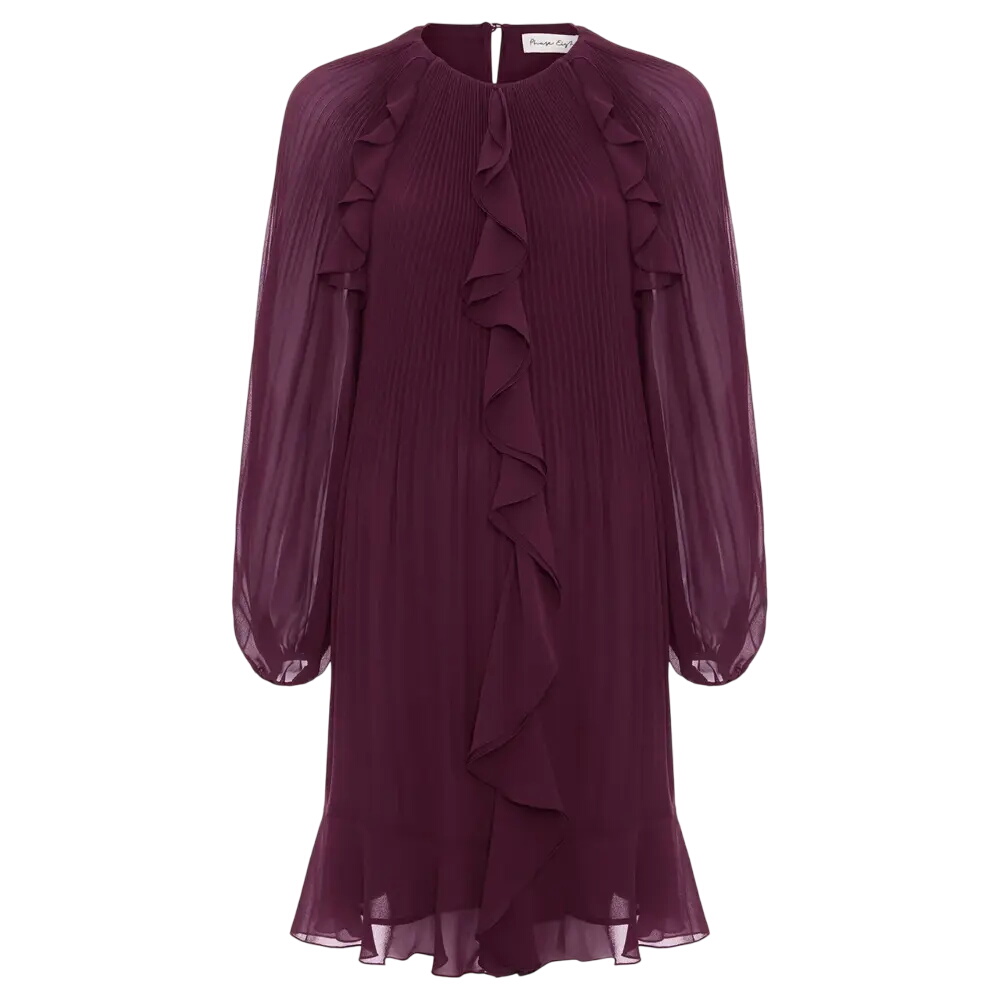 Designed with versatility in mind, this unique burgundy mini dress is the perfect way to incorporate the mini silhouette into your day and evening wardrobes. With expressive ruffle details, eye-catching pleating and sheer voluminous sleeves. Wear with heels and a clutch for your upcoming events or tights and boots for an elevated weekday look.