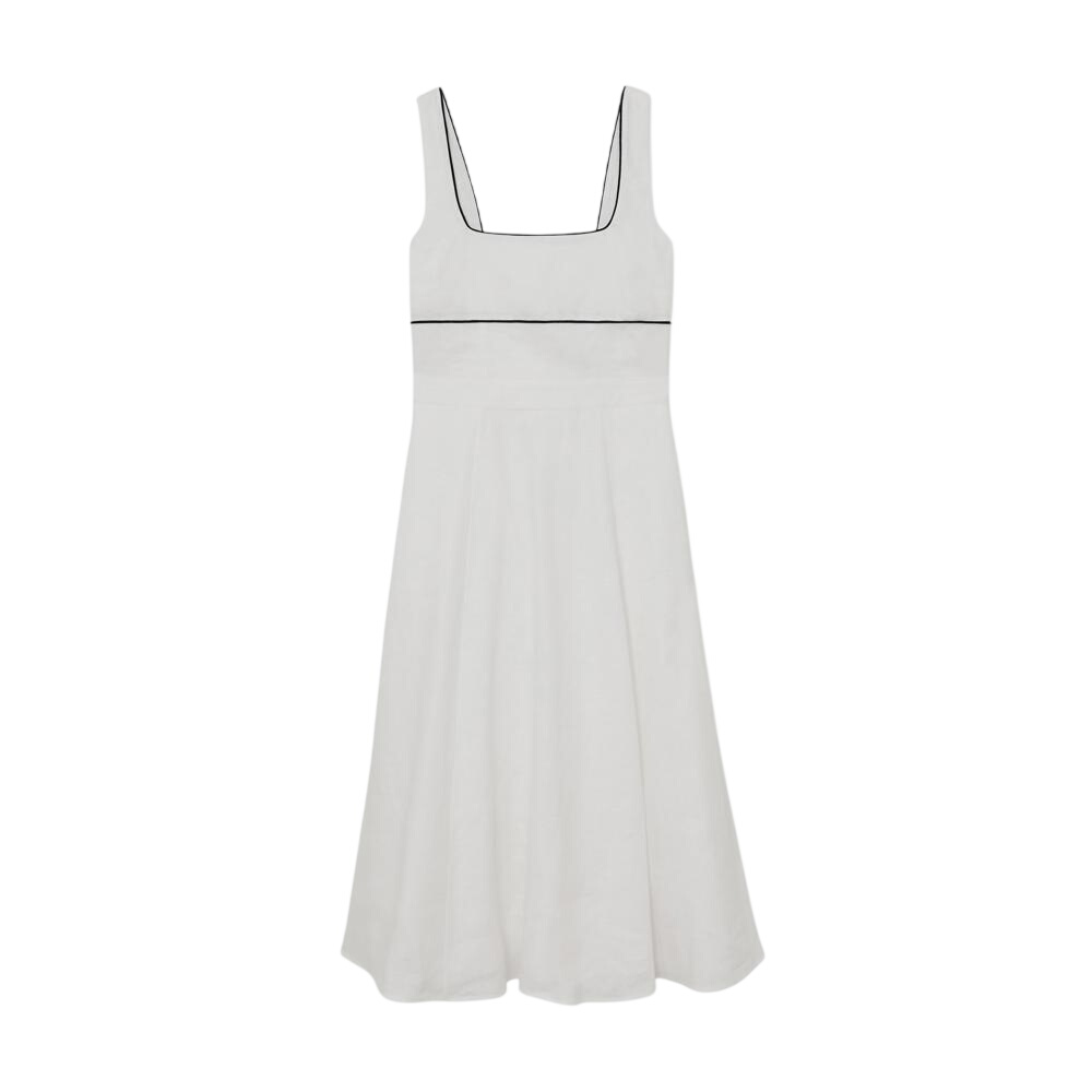 The Dorethea midi dress is crafted from 100% linen with contrasting trim at the square neckline and under the bust. It has a sleeveless bodice and a full skirt.