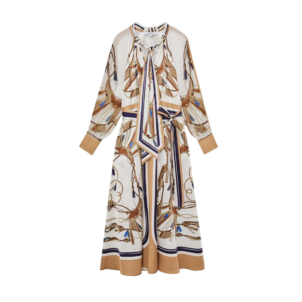 The ivory/neutral Ellie dress is crafted from satin-finish fabric in a vintage-inspired foulard print. It features a tie neckline with cut-outs, sheer cuffed sleeves, and a self-tie belt.