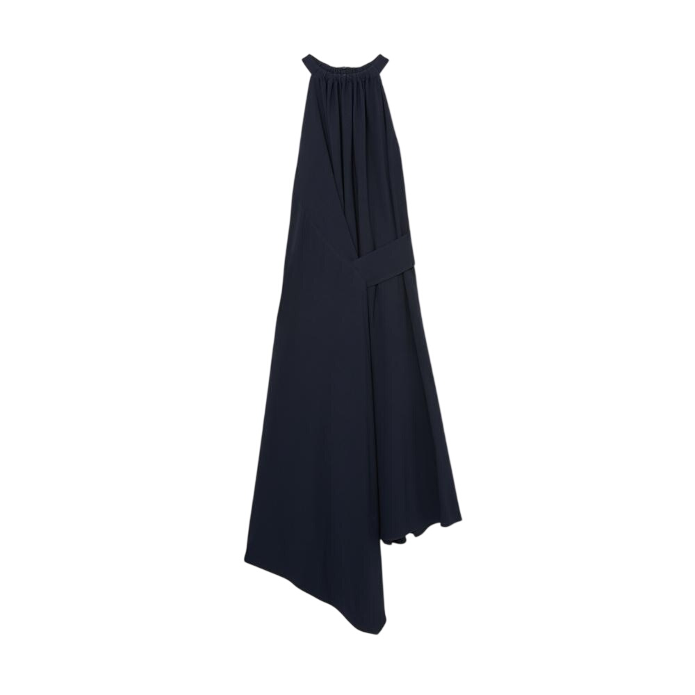 The Maeve dress features a draped waist detail that creates a fluid, asymmetric silhouette. It has a gathered neckline, is sleeveless and fastens with a buttoned keyhole.