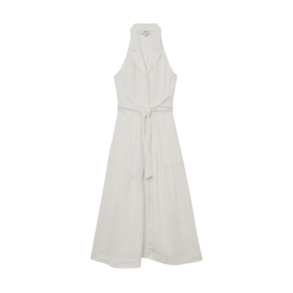 The Ivory Tor dress is a classic midi silhouette with a halter neck and peak lapels. A discreet open-back detail meets an attached self-tie belt, defining the waist.
