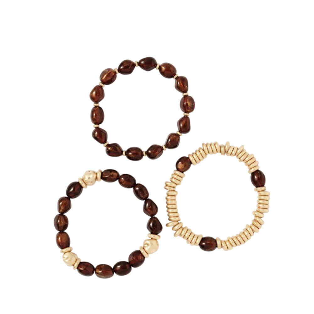 - Set of three elasticated brown and gold-tone beaded bracelets.