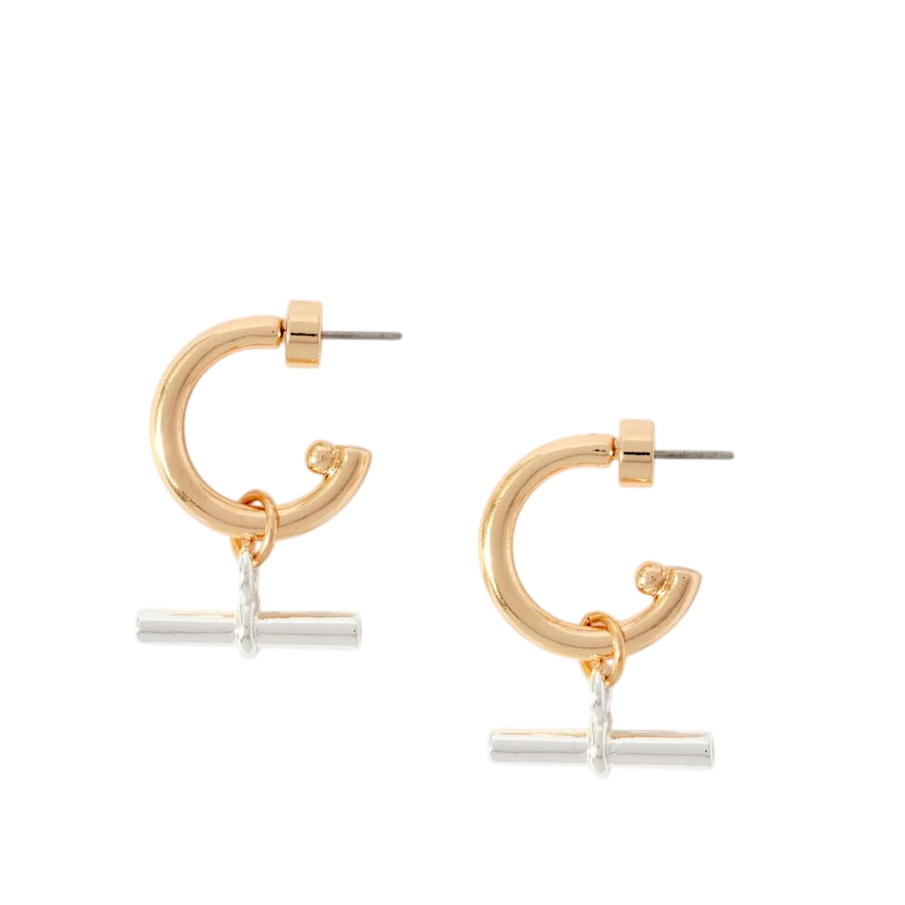 - Mixed metal hoop earrings featuring a hanging T-bar charm and clasp fastening.