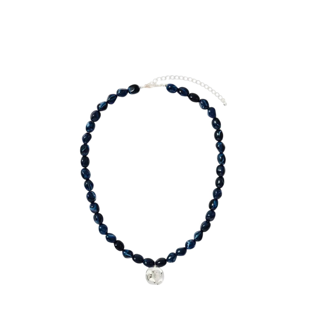 - Navy resin beaded necklace featuring a silver tone charm with an adjustable lobster clasp fastening.