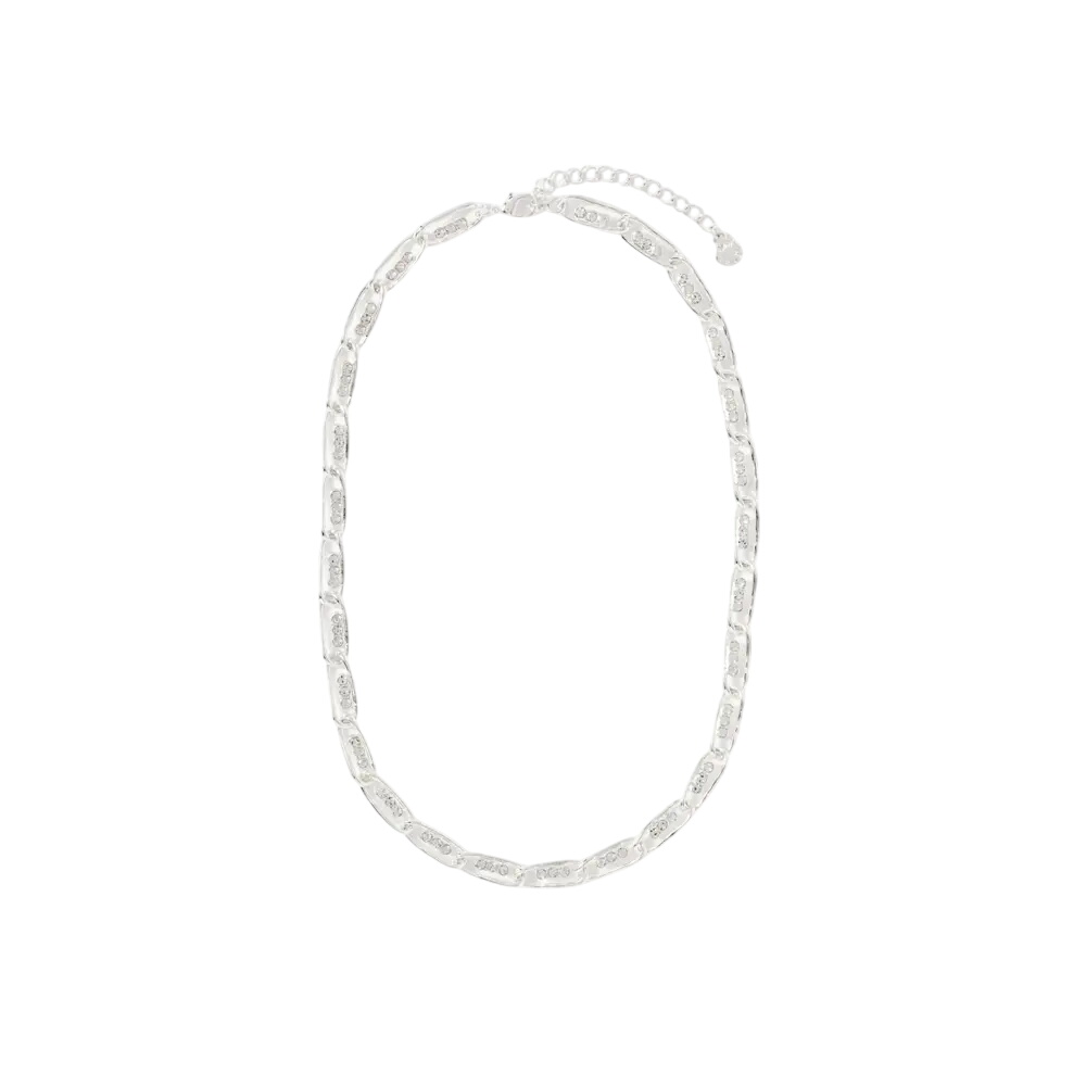 - Silver tone link chain necklace with pave encrusted detailing and an adjustable lobster clasp fastening.