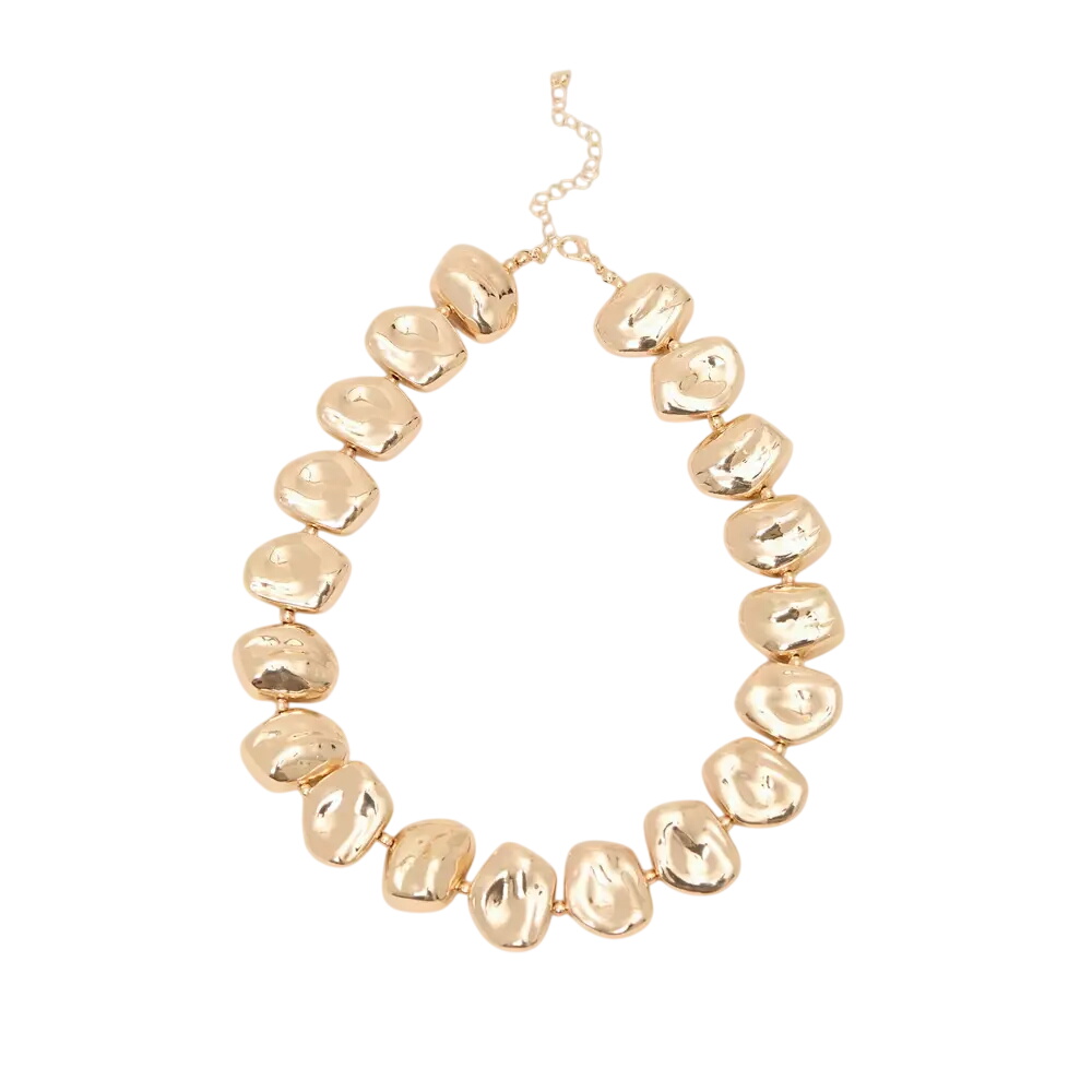 Our gold chunky necklace is perfect for adding a touch of statement to all your looks. Oversized irregular beads embellish this jewellery style that we love to pair with our matching bracelet to add a coordinated finish to evening outfits.