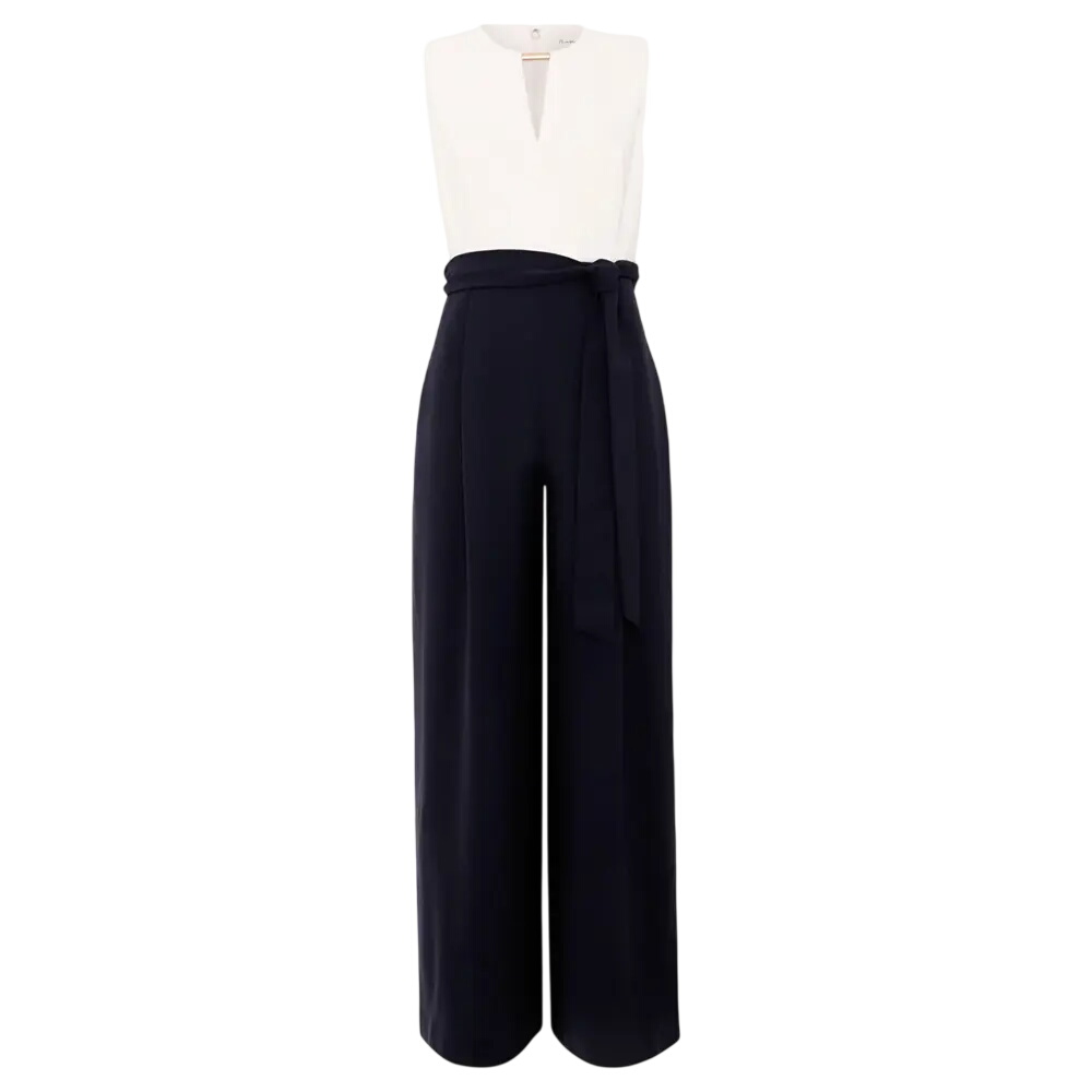 The contemporary way to do chic event style. In a classic ivory and navy colour palette, this wide leg jumpsuit features an elegant sleeveless bodice with a unique keyhole detail and gold hardware at the neckline. With a tie belt at the waist, this jumpsuit flows into a fluid wide leg silhouette, adding a touch of understated drama to the shape. Style with matching ivory accessories to finish off the look.