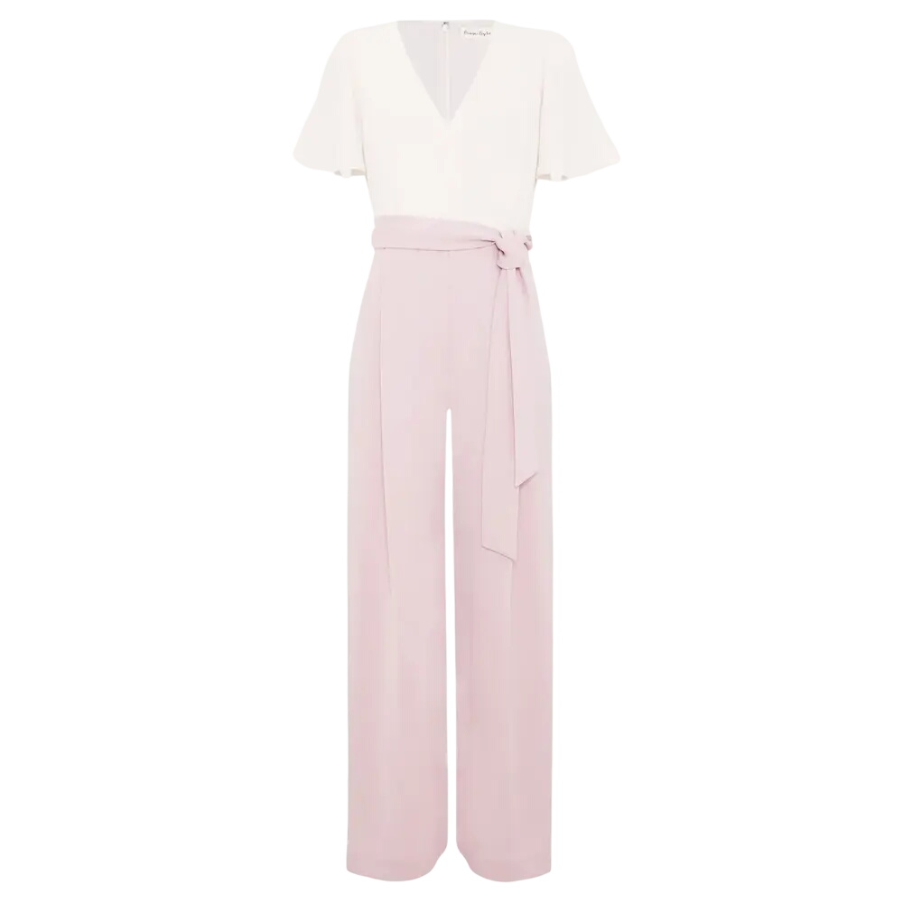 Loved by you, designed in a brand-new colour for the season ahead. In a beautiful pale pink shade, the Kallie jumpsuit features a modern wide leg silhouette, a feminine V neckline framed by romantic frill details and a matching tie waist belt to enhance the shape. Wear with heels and matching clutch to your next RSVP.