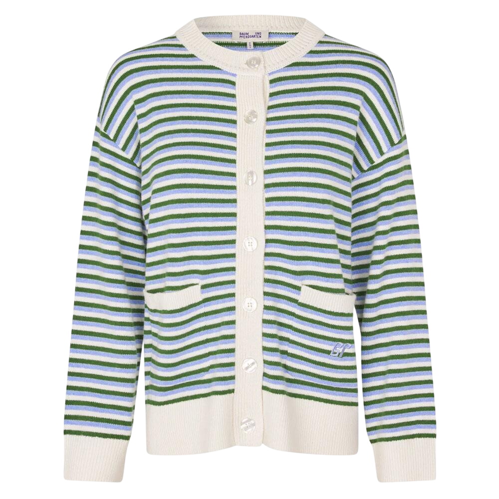 Introducing the Baum und Pferdgarten Cindie Cardi,gan a chic and versatile addition to your wardrobe that effortlessly combines style and comfort. This striped cardigan is crafted with meticulous attention to detail, showcasing the brand's commitment to quality and contemporary design.