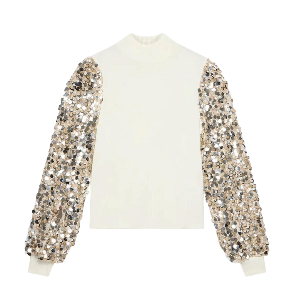 - Cream tone jumper with a high neckline and long sequin embellished sleeves with elasticated cuffs.