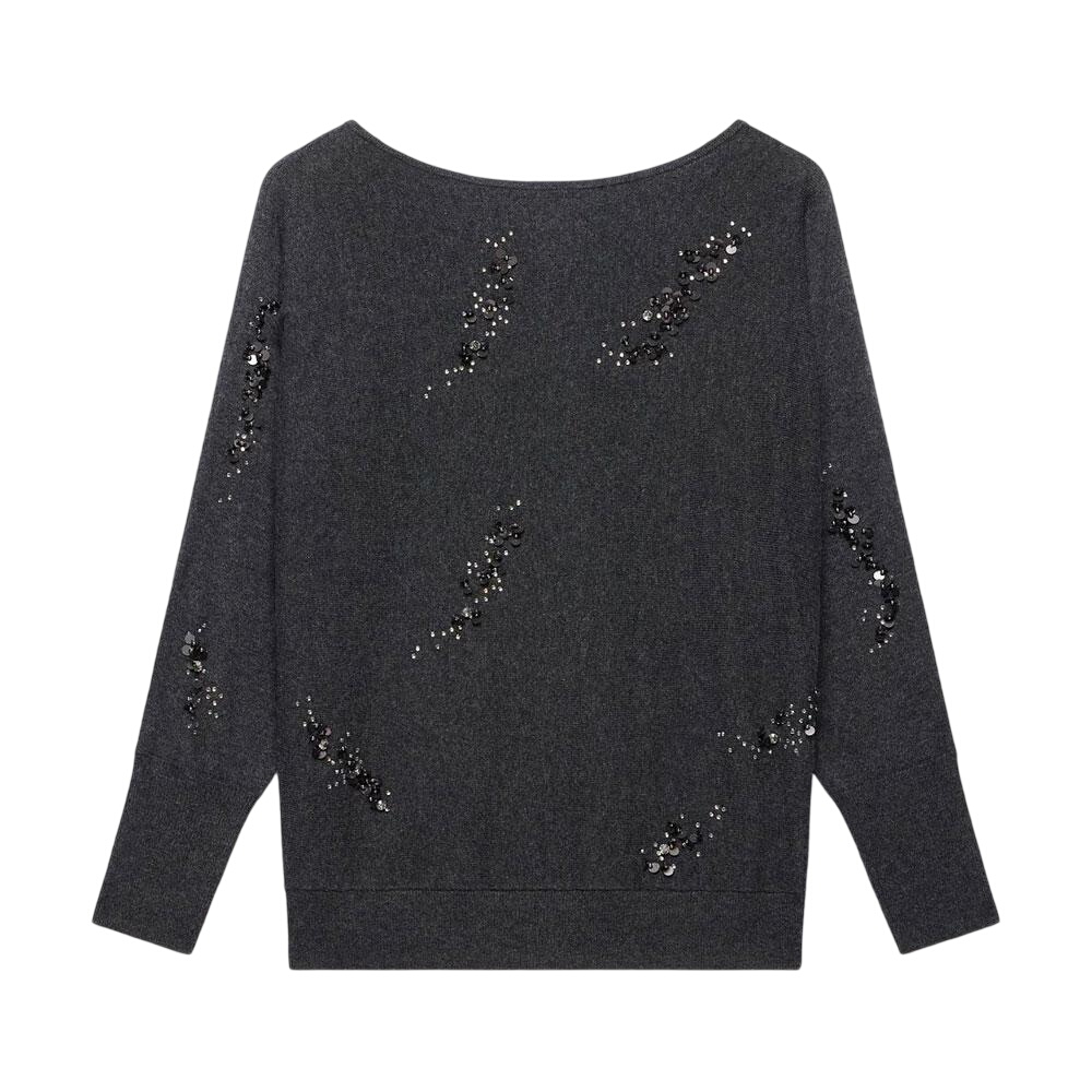 - Grey jumper featuring a wide neckline, long batwing sleeves and sequin embellishment.