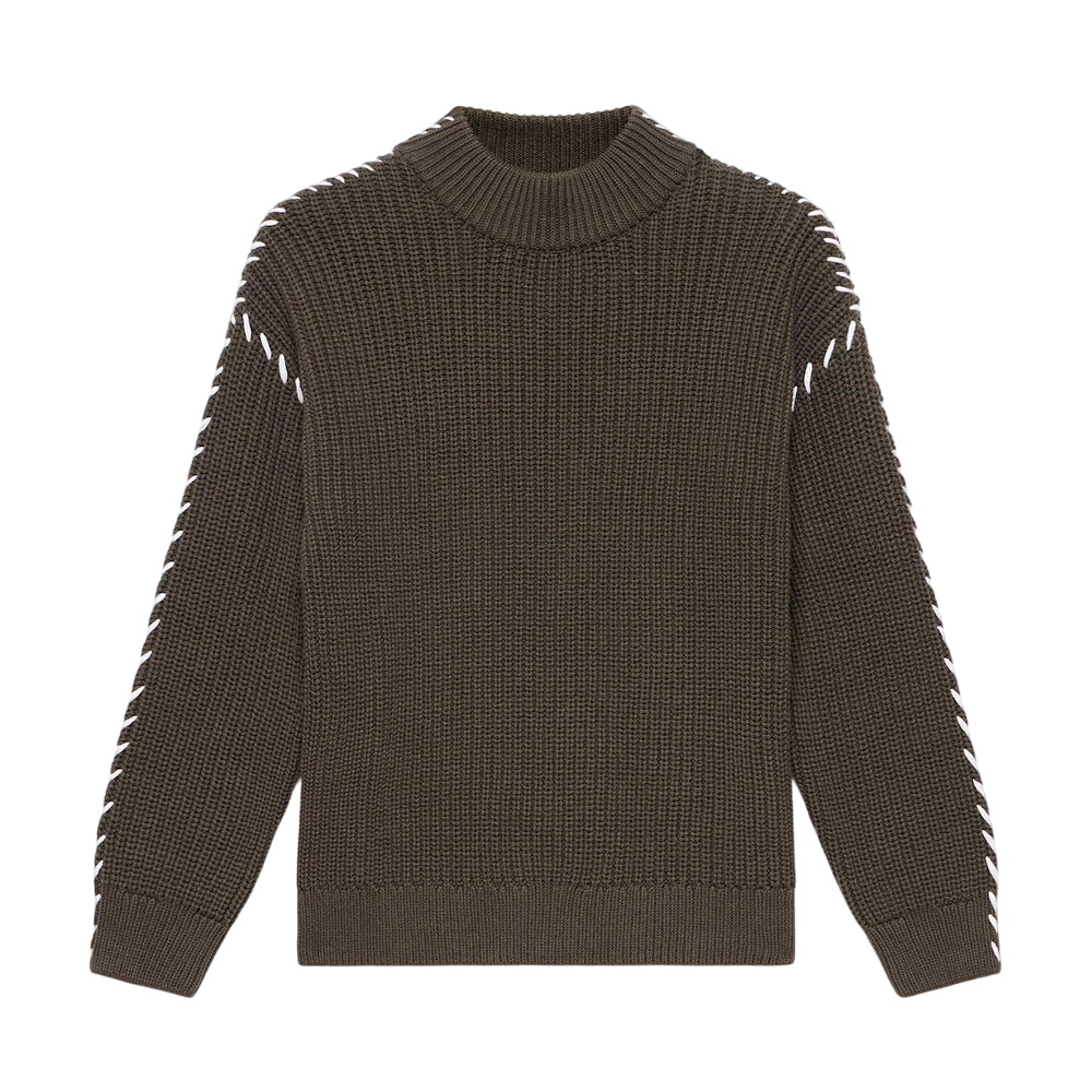 - Khaki tone jumper featuring a crew neckline, long sleeves with contrast whipstitch detailing.