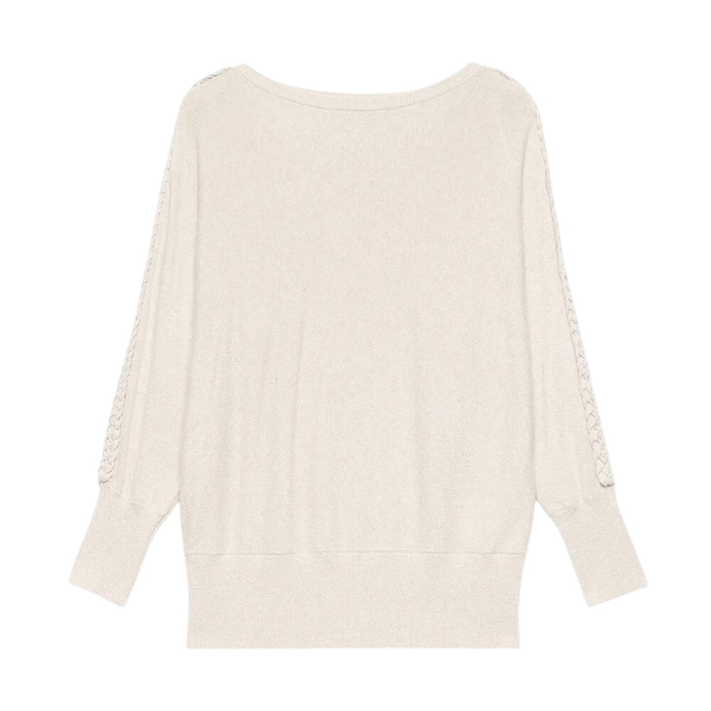 - Neutral tone jumper featuring a slash neckline, long batwing sleeves, plaited sleeve trim and a wide waistband.
