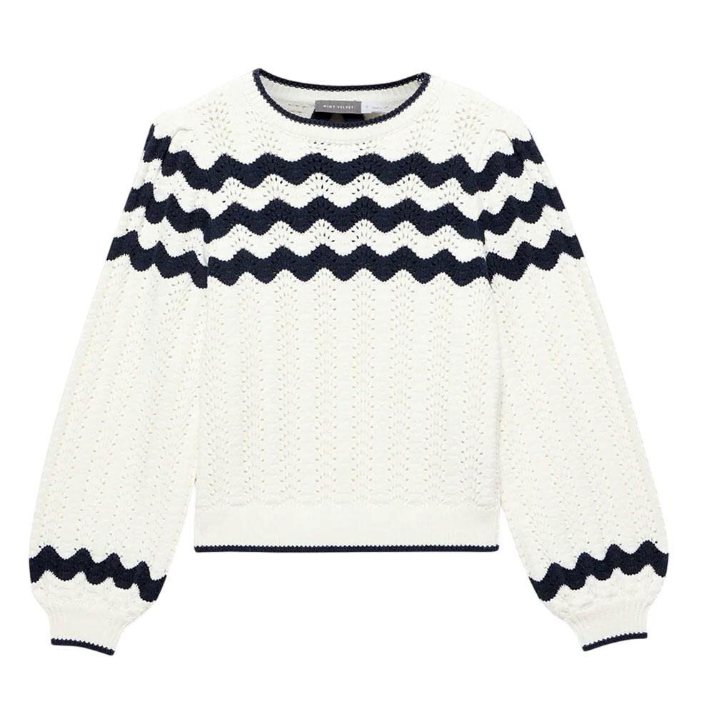 - Neutral wavy striped jumper featuring a crew neckline, long sleeves, contrast trim with bow and key hole detailing through the back.