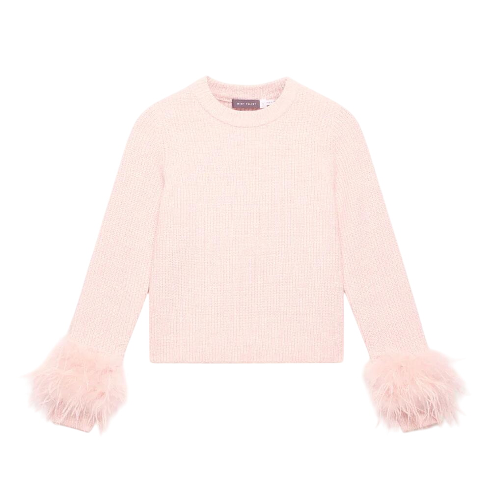 - Pink knit jumper featuring a crew neckline, long sleeves with feather trim cuffs.