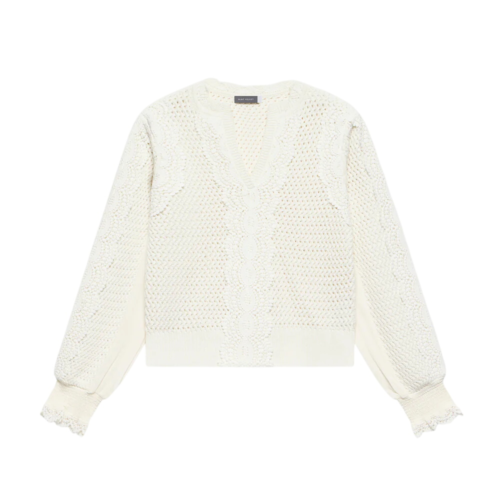 - White open knit jumper featuring a V-neckline, long sleeves, shirred cuffs and crochet trim detailing.