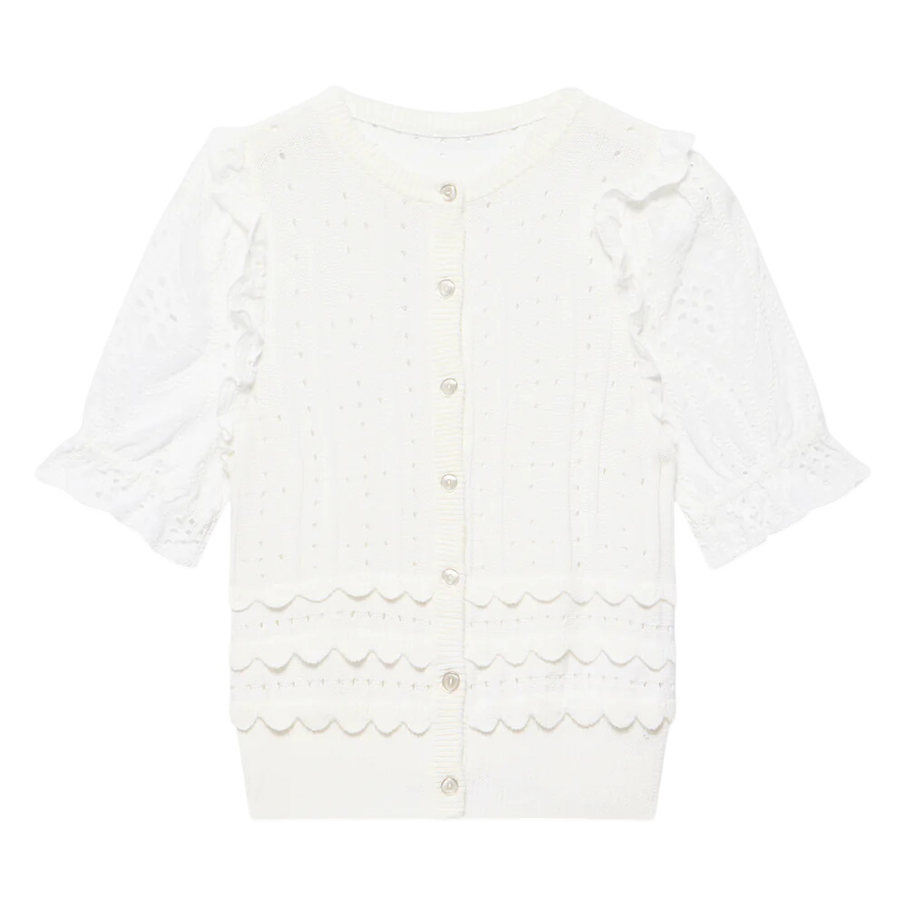 - White knit top featuring a crew neckline, short broderie sleeves, scallop detailing with a button fastening through the front.