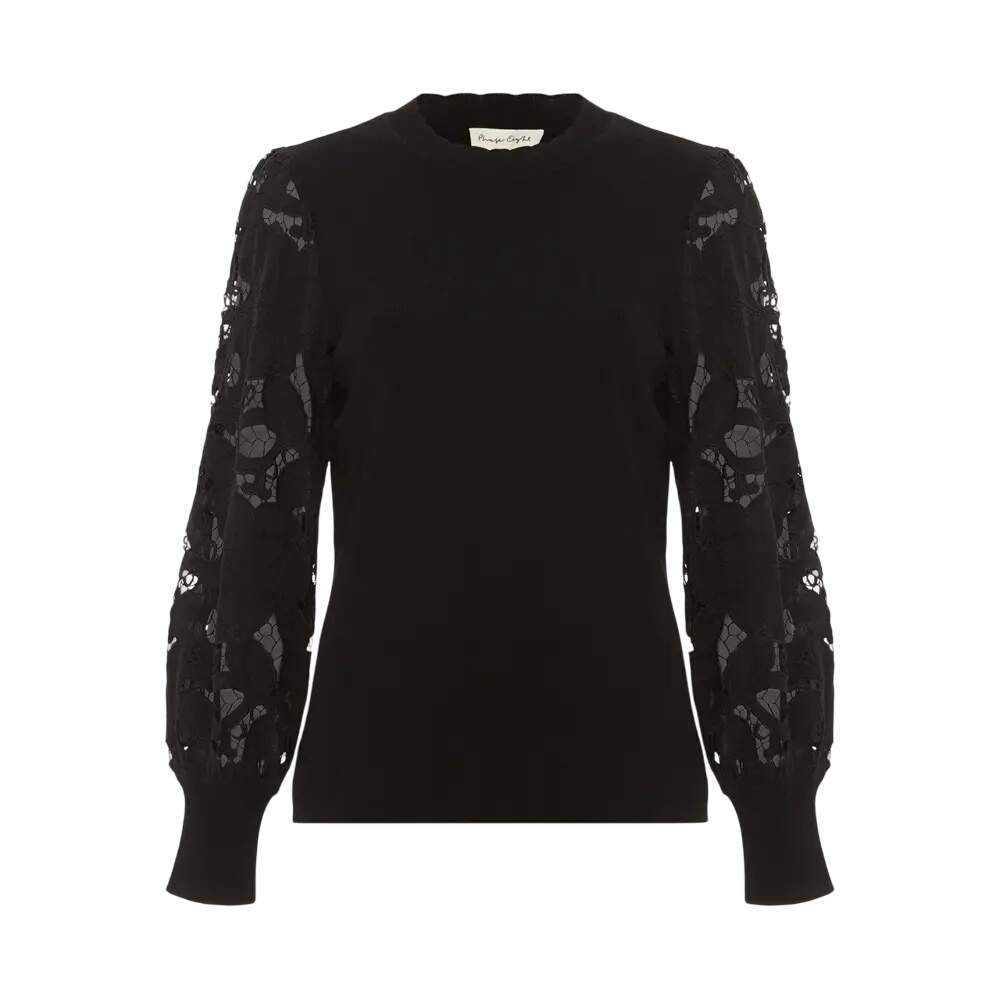 This black jumper is the true definition of an office to weekend style. Featuring intricate lace blouson sleeves and a soft scallop neckline, it’s a modern update on your must-have black knit. Designed with versatility in mind, pair with trousers, jeans and skirts for all your seasonal plans.