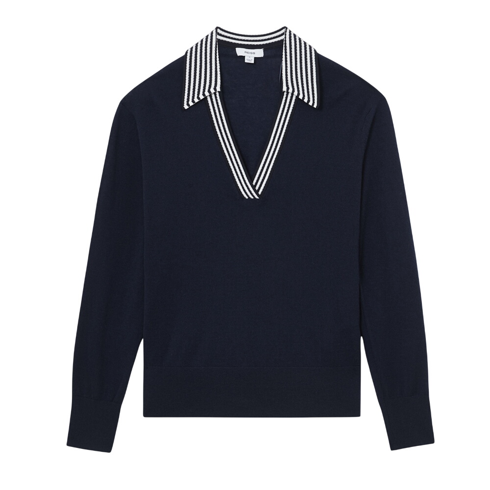 The Navy/White Nova jumper is knitted from 100% merino wool for a soft and lightweight handle. It’s defined by a striped open collar and V-neckline.