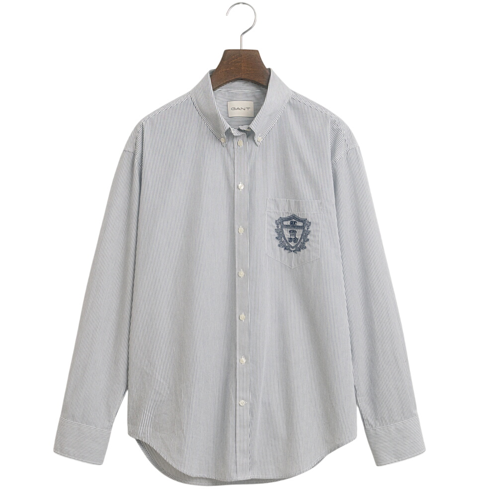 The cotton poplin shirt, designed for a relaxed fit, showcases yarn-dyed stripes. It includes all the signature elements of GANT shirts – a button-down collar, adjustable cuffs, curved hem, and a box pleat with an innovative locker loop at the back. Additionally, it features a seasonal crest graphic embroidered on the chest pocket. This shirt is designed for a relaxed fit, but if you prefer a closer fit, we suggest sizing down.