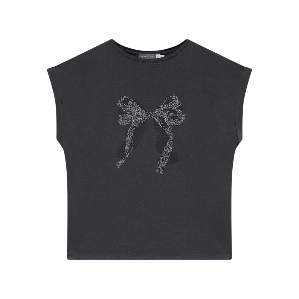 - Black t-shirt featuring a crew neckline, short sleeves and embellished bow detail.