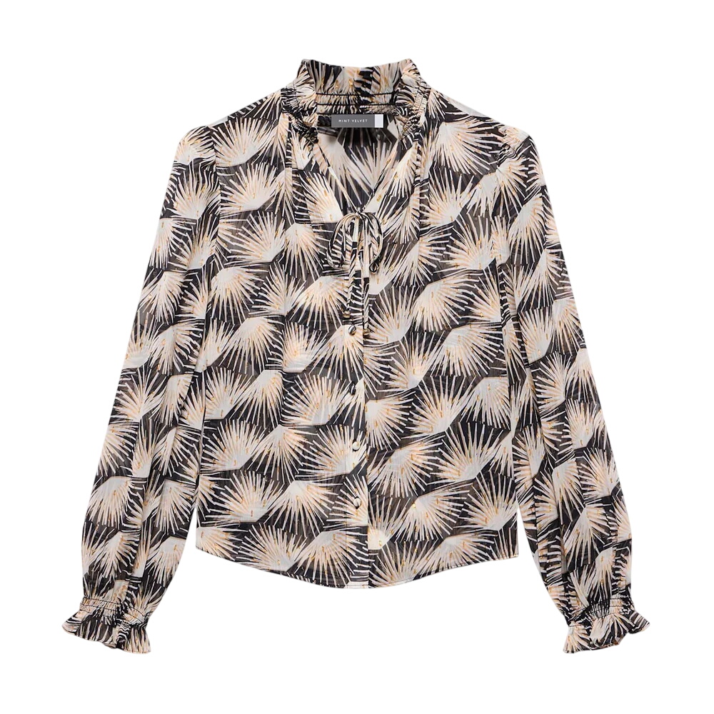 - Black geo print blouse featuring a V-neckline, shirred collar, long sleeves, elasticated fluted cuffs, metallic fleck detail, drop hemline with a button and tie fastening through the front.