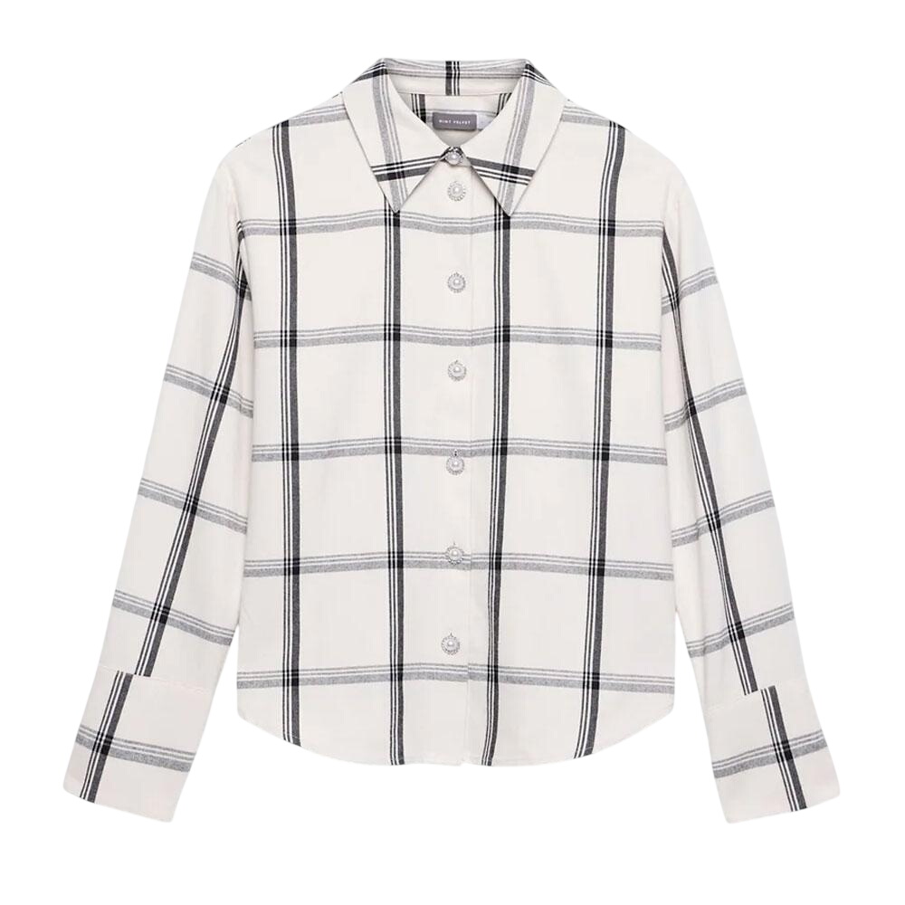 - Cream check shirt featuring a classic collar, long sleeves, buttoned cuffs and diamante pearl button fastening through the front.