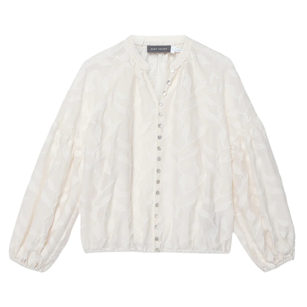 - Cream floral jacquard blouse featuring a crew neckline, long blouson sleeves, elasticated cuffs and waistband with a button fastening through the front.