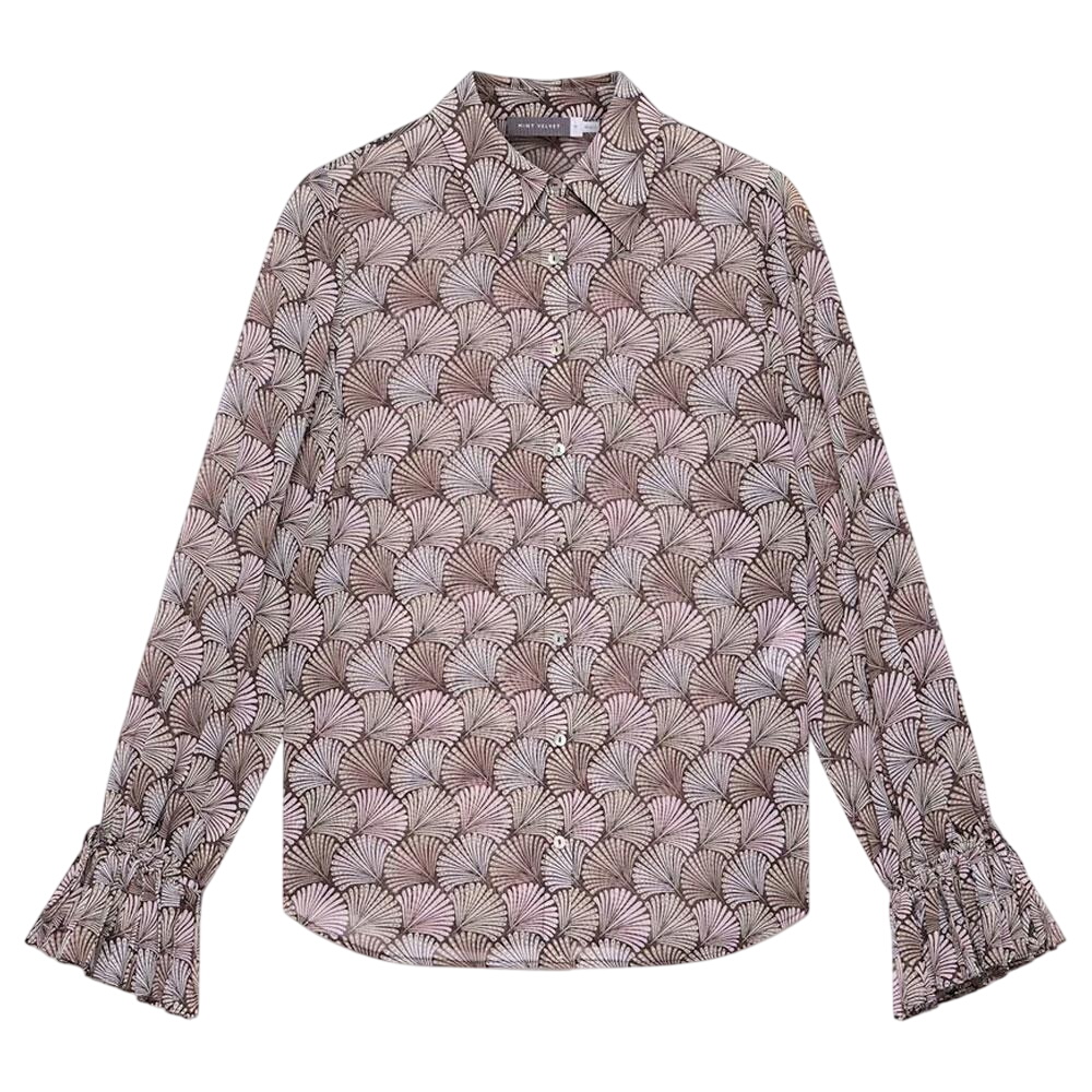 - Neutral fan print shirt featuring a classic collar, long sleeves, fluted tie cuffs, curved hemline with a button fastening through the front.