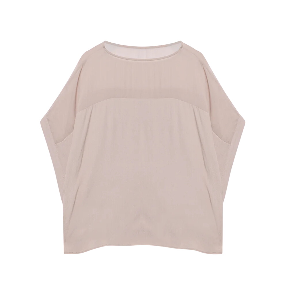 - Neutral tone layered top featuring a crew neckline, sheer panel and wide cap sleeves.