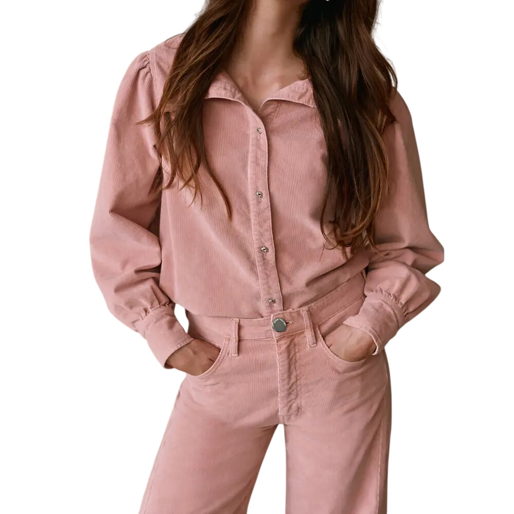 - Pink corduroy shirt featuring a classic collar, puff shoulders, long sleeves, buttoned cuffs with a button fastening through the front.