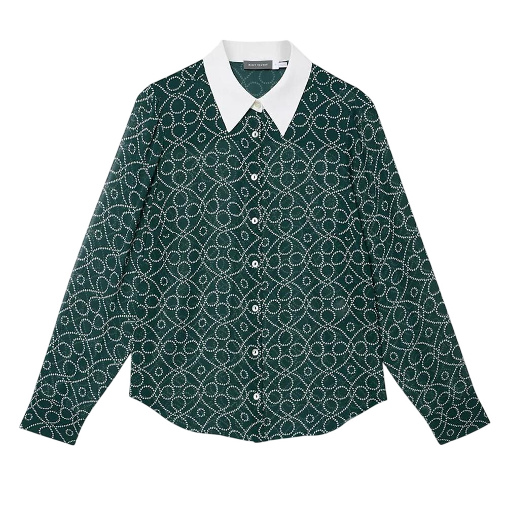 - Teal printed sheer shirt featuring a contrast classic collar, long sleeves, buttoned cuffs, scooped hemline with a button fastening through the front.