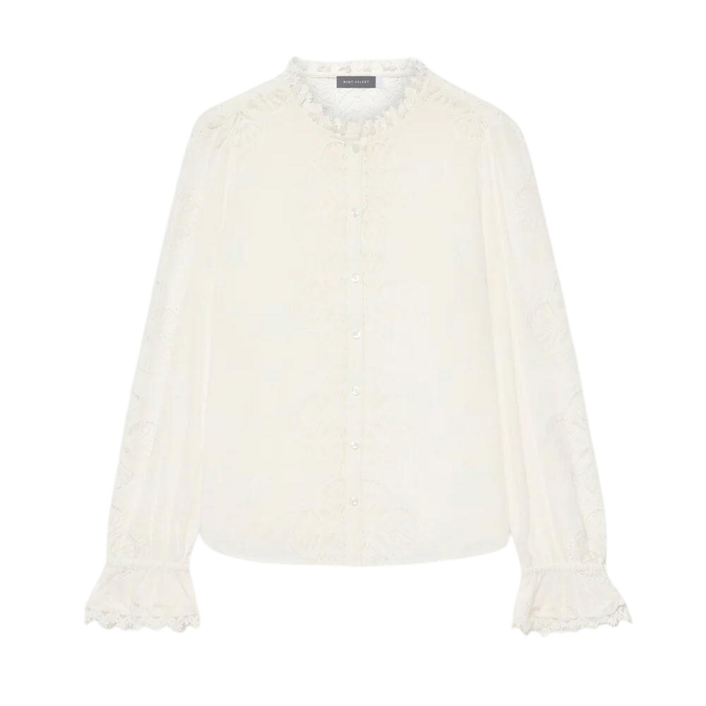 - White cotton blouse featuring cut-out lace embroidery, high neckline, long sleeves with elasticated cuffs and a button fastening through the front.