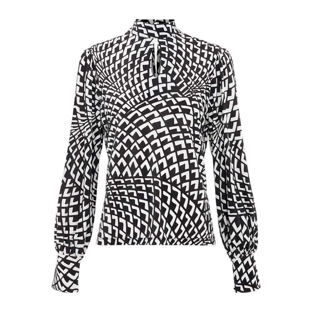 A blouse to take you effortlessly from day to night, work to weekend. Designed in a modern monochrome geometric print, this blouse features an elegant high neck with keyhole detail and fluid blouson sleeves. Style with your favourite jeans or black trousers for the ultimate versatile look.