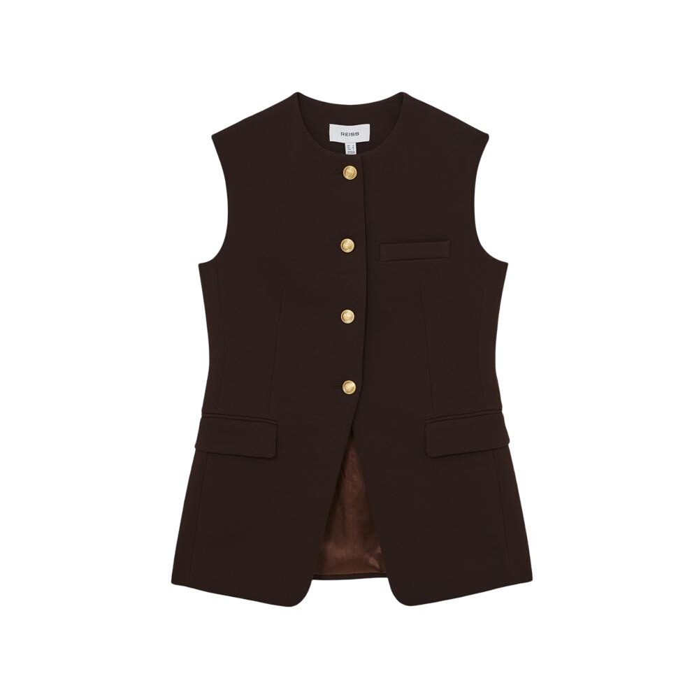 The Priya waistcoat is tailored to a longline silhouette, with a high neckline and a cut-away front. Polished crest-embossed buttons accent the front for a refined finish. High neckline, Flap welt pockets, Cut-away front, Crest-embossed front buttons.