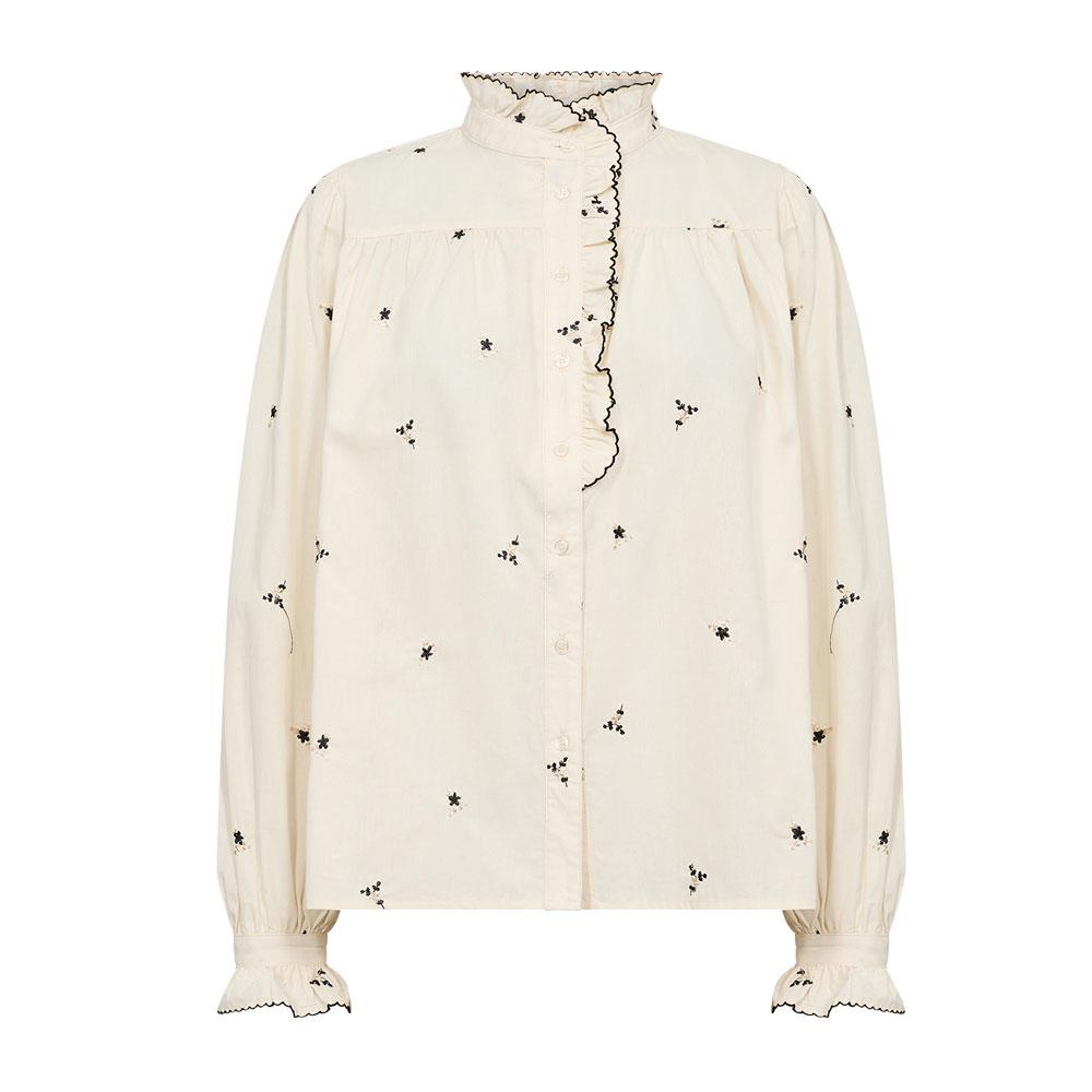 This Soyaconcept shirt is made from 100% organic cotton. It features a ruffled high collar, delicate front button closure, and floral embroidery. Pair it with tailored slacks or jeans for a casual yet stylish look.