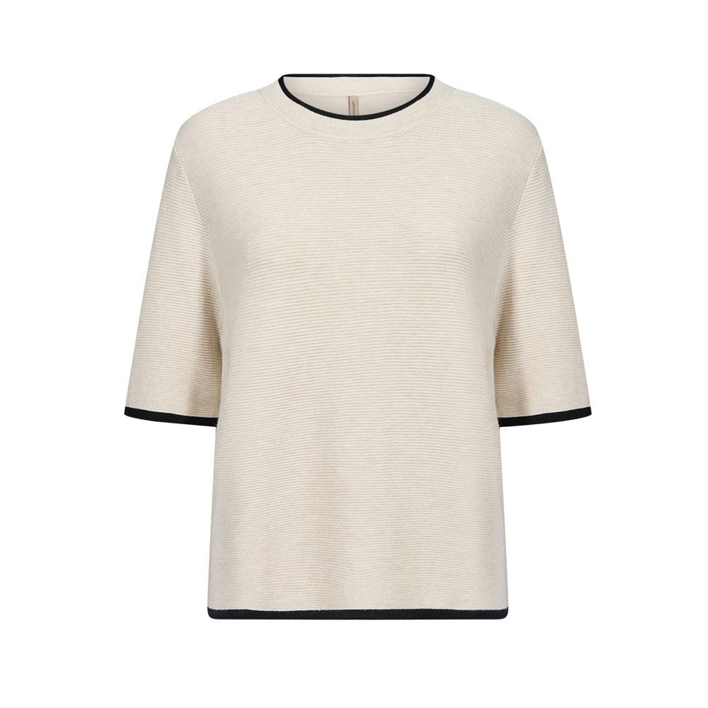 The pullover features a round neckline, short sleeves, and textured ribbed design with contrast trim detailing. Pair it with tailored trousers or a relaxed skirt for a stylish look.